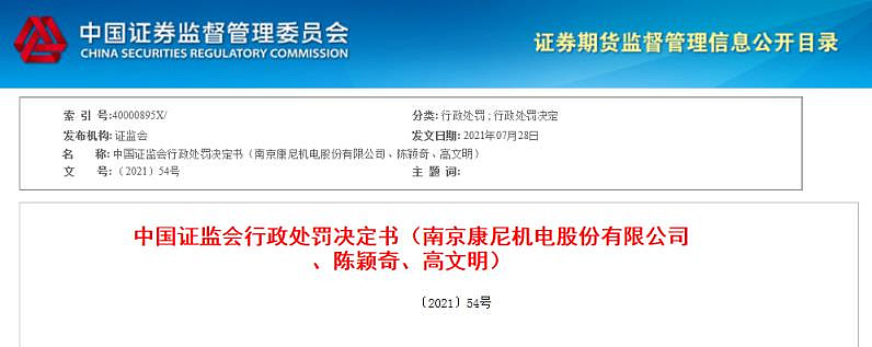 证监会网站8月3日更新的一则行政处罚决定书显示,证监会对康尼机电信息披露违法违规行为进行了立案调查、审理,决定对康尼机电责令改正、给予警告,并处以30万元罚款;对时任康尼机电董事长陈颖奇,时任康尼机电副董事长、总裁高文明给予警告,并分别处以5万元罚款。