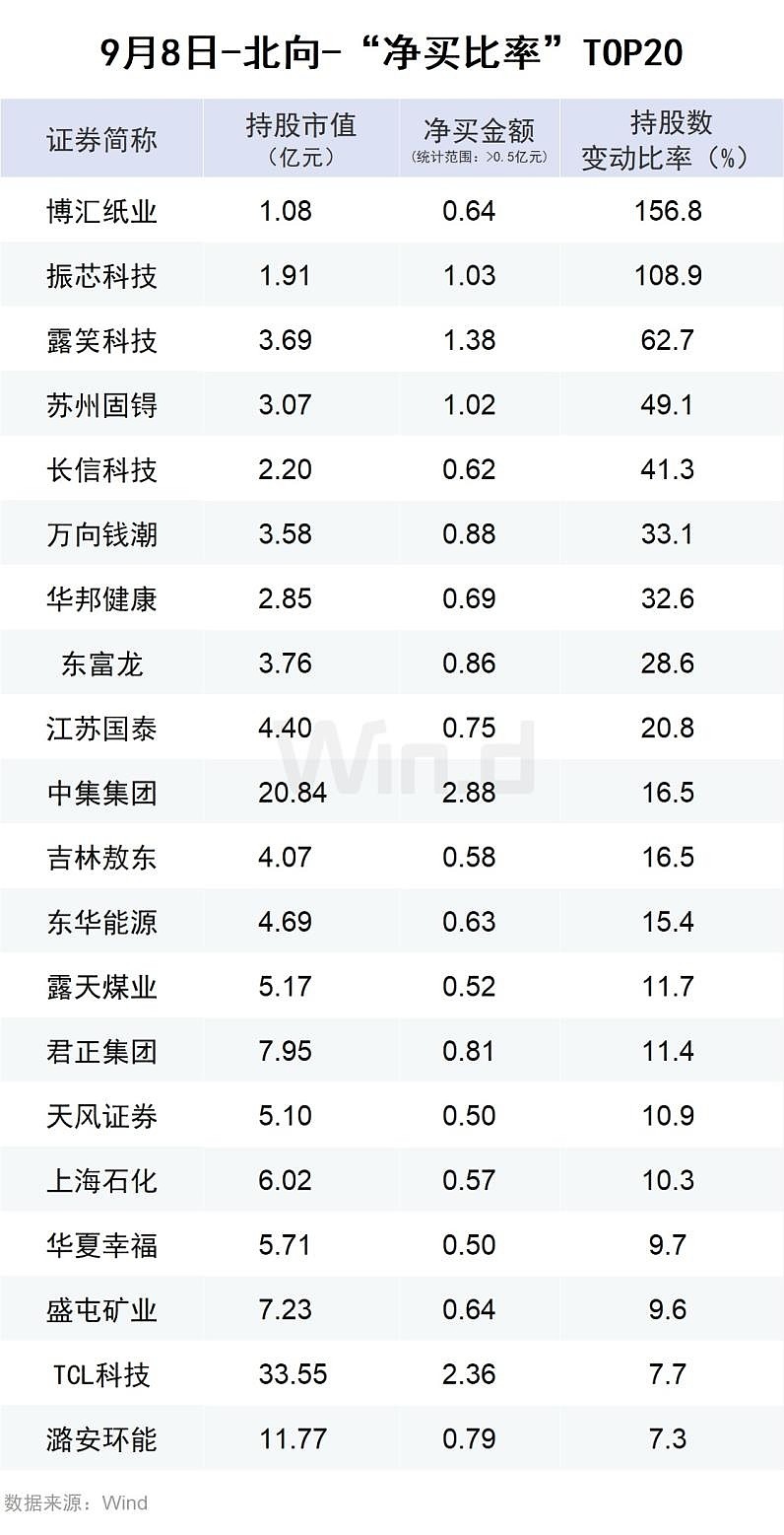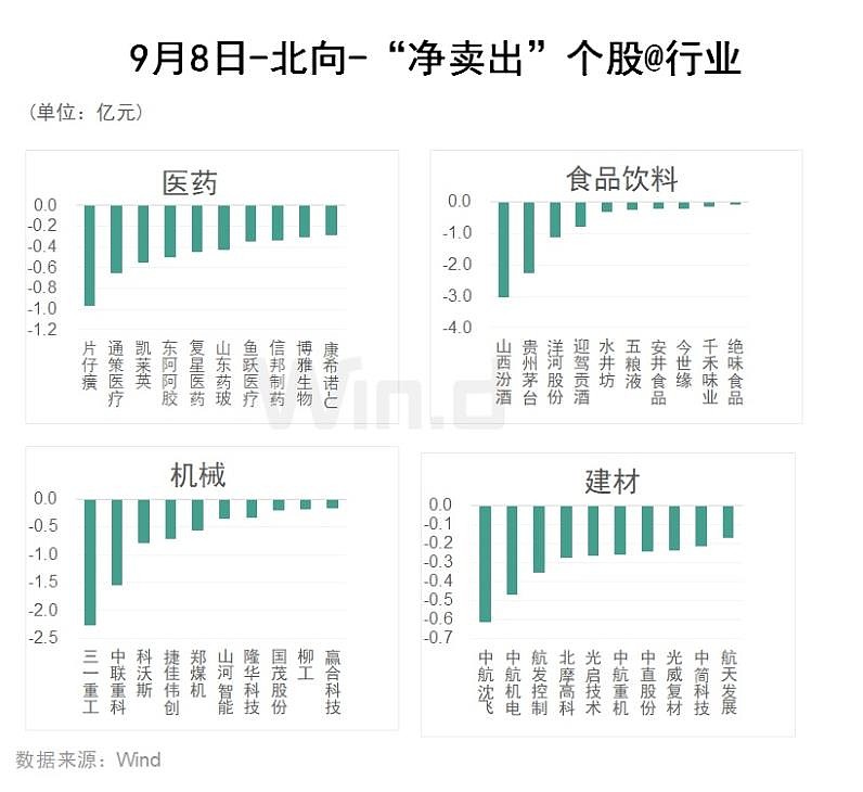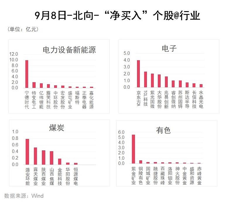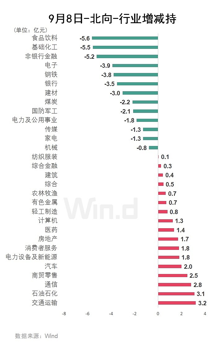 Wind通过统计分析发现,从行业角度来观察,9月8日,北向资金净买入前五的行业有:交通运输、石油石化、通信、商贸零售、汽车、电力设备新能源;净卖出金额靠前的行业有:食品饮料、基础化工、非银行金融、电子、钢铁。