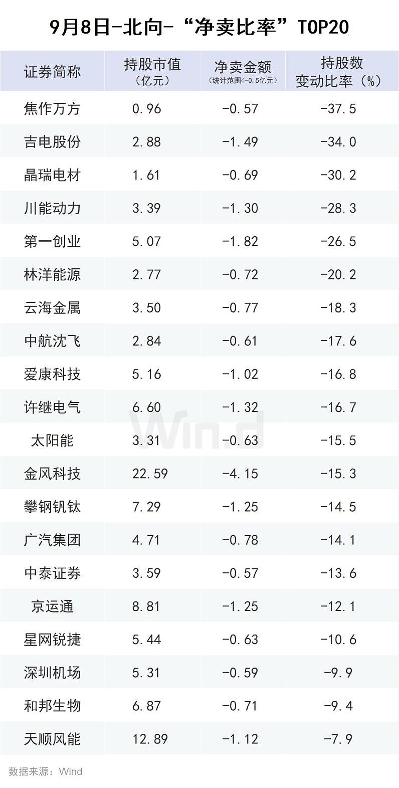 增减持比例方面,中集集团、TCL科技增持金额较大,增持比例较高;吉电股份、金风科技、攀钢钒钛等被减持金额较大,减持比例较高。