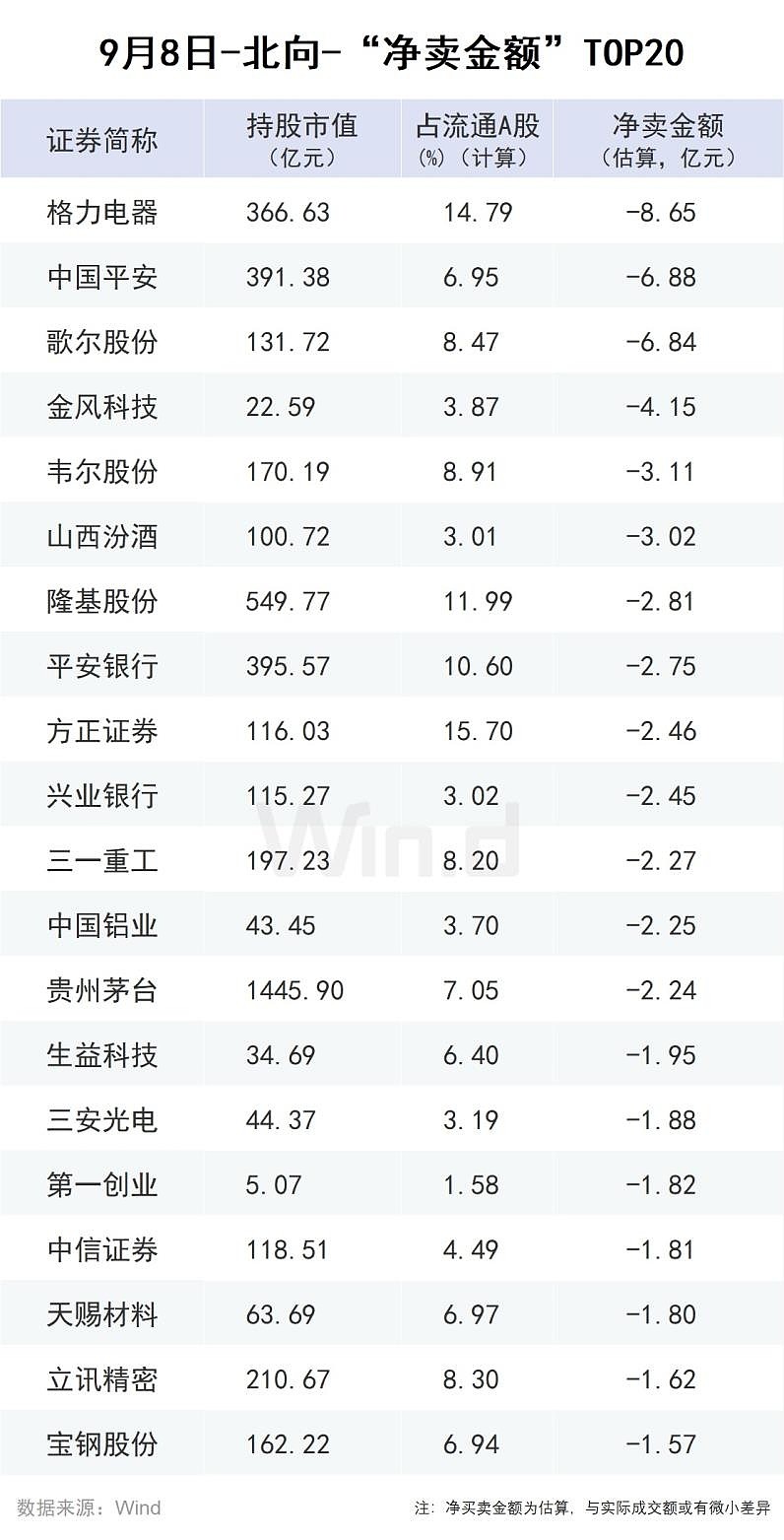 9月8日,终结连续12日净买入。上午北向资金犹豫观望,买卖平衡,下午,持续净卖出,但力度微小,最大峰值也不过净卖20亿元。