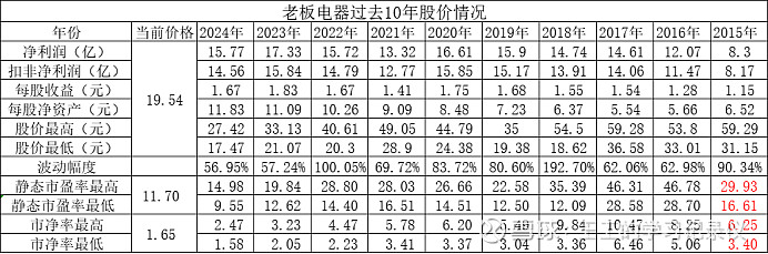 从上表可以看出老板电器公司当前股价、市盈率、市净率均处于历史低位。且相较于过去三年平均利润是市盈率为11.34,小于15倍。当期市净率1.65,市盈率与市净率的乘积18.7小于22.5。所以在当前价格买入后期盈利的概率较大。