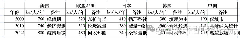 这个数据中国的部分使用的是统计局的垃圾清运量/全国人口算出来的。其他国家的额来自于AI,口径不清楚,差距很大感觉不太靠谱。