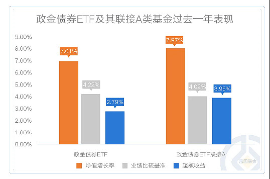 而主要投资于政金债券ETF(511520)的富国中债7-10年政策性金融债联接A(以下简称:政金债券ETF联接A),业绩表现也十分出众,过去一年净值增长7.97%,业绩比较基准为4.02%,超额收益为3.95%。