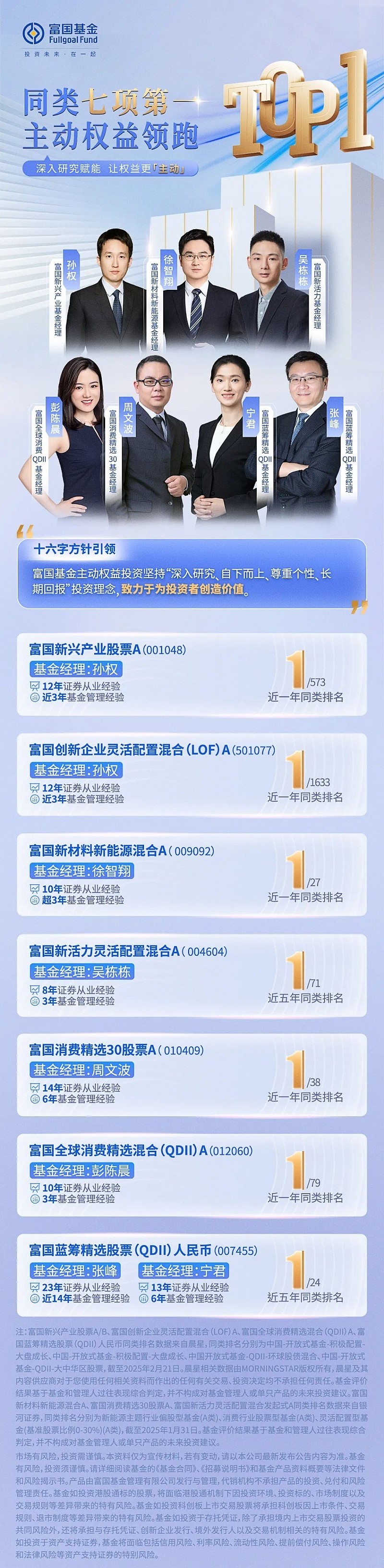 注:富国消费精选30股票A业绩相关数据来自富国基金,经托管行复核,截至2025年2月21日。基金历史业绩不构成对未来业绩的保证。基金排名数据来源于银河证券,近一年同类排名1/38,同类类别指消费行业股票型基金(A类),时间截至2025年1月31日。