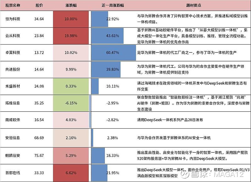 1. 恒为科技:与华为昇腾合作开发了异构智算中心技术方案,并推进私域模型训练一体机项目。