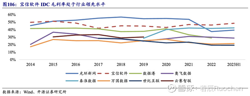 宝信凭借在核心城市的战略布局、资源优势以及优秀的成本控制能力,使其IDC业务具备强劲的盈利能力。一是依靠宝武过剩的钢铁产能,宝信拥有丰富的土地、水、电力和能耗指标资源,这些资源为其IDC业务的快速建设和交付提供了有力支持。此外,宝信有独立专业的设计建设团队、强劲的系统开发能力,是目前市场上稀缺的在 IDC 领域进行全面自主设计研发的企业。对比宝信和同行的毛利率,可以看出宝信IDC业务的盈利水平如何。