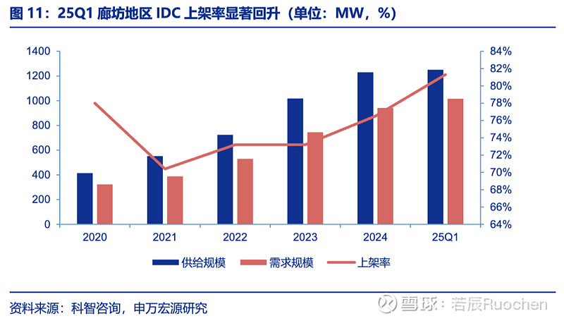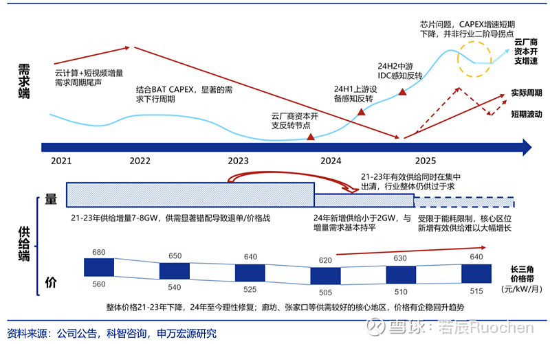 以上是对宝信IDC业务当前营收情况的分析,可以看出IDC业务保持了稳健的经营,并没有大幅恶化。下面主要从IDC行业周期和宝信固定资产投资的角度分析下IDC业务后续可能发生的变化。行业整体在22年之前经历了快速的扩张,后续随着互联网大厂等云厂商资本开支的减少,出现了供给过剩。从去年开始,随着国内AI的兴起,各云厂商的资本开支开始增加,IDC的价格和上架率明显提升。虽然目前行业整体仍供过于求,但因为能耗指标的限制,核心城市的有效供给无法大幅增长,后续有希望迎来行业的拐点。