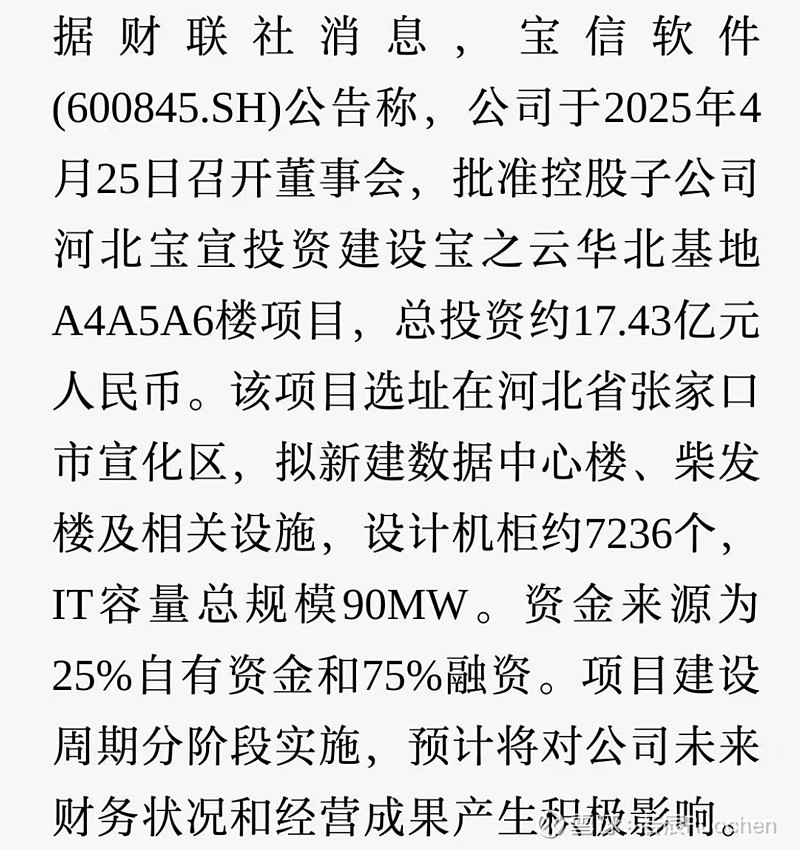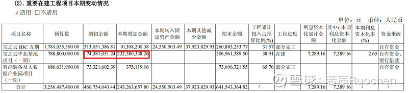 宝信近年的固定资产没有大幅增长,在建工程从去年下半年开始大幅增加,其中一半是对应中标字节的华北基地项目。具体中标情况:2024年9月,宝之云华北基地中标某互联网巨头IDC项目,承接 120MW IT订单(含已接收的60MW和预留的60MW),占规划总规模的 75%以上。该项目总规划建设2万个8kW机柜,总IT规模达160MW,总投资37亿元。从华北基地一期的预算数推断,一期在建工程对应的应该是中标信息中“已接收60MW“。