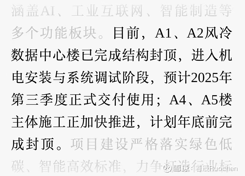 该项目进展顺利,预计A1、A2数据中心楼三季度正式交付使用。并且今年上半年,宝信董事会批准了后续的A4、A5、A6楼扩展项目,对应90MW的IT规模,17亿投资。按照宝信稳健的投资风格,扩展项目应该是评估下来不愁卖才会开始施工。在工程进度上,A4、A5楼年底预计也会封顶,明年年底前可能会投入使用。
