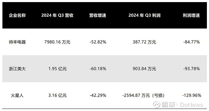 如吴杨、钱明所言,据老板电器2024年半年报显示,1.83亿元的集成灶营收仅占老板电器报告期内营收的3.87%。有限的营收分流到老板不同体系下的销售渠道,单家门店集成灶出货量可想而知。不仅仅是老板电器的集成灶难卖,2024年Q3美大、帅丰、火星人均出现营收和利润双降的情况。