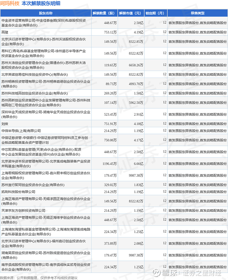 证券之星消息,根据市场公开信息整理,珂玛科技(301611)于8月18日将有8658.27万股限售股份解禁,为公司首发原股东限售股份,首发战略配售股份,占公司总股本19.86%。(本次数据根据历史公告整理得出,实际情况以上市公司最新公告为准)最近一年内,该股累计解禁360.19万股,占总股本的0.83%。本次解禁后,公司还有2.89亿股限售股份,占总股本66.38%。具体如下图所示: