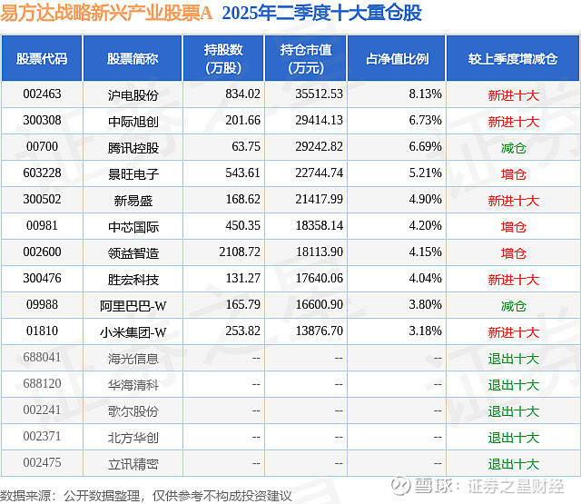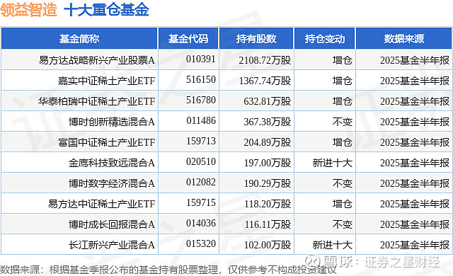 根据2025基金半年报公募基金重仓股数据,重仓该股的公募基金共20家,其中持有数量最多的公募基金为易方达基金的易方达战略新兴产业股票A。易方达战略新兴产业股票A目前规模为34.62亿元,最新净值1.3084(8月22日),较上一交易日上涨4.51%,近一年上涨96.96%。该公募基金现任基金经理为欧阳良琦。欧阳良琦在任的基金产品包括:易方达中盘成长混合,管理时间为2025年4月12日至今,期间收益率为39.64%。