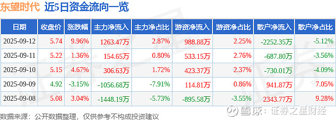 证券之星消息,东望时代9月12日涨停收盘,收盘价5.74元。该股于10点28分涨停,5次打开涨停,截止收盘封单资金为1264.12万元,占其流通市值0.26%。