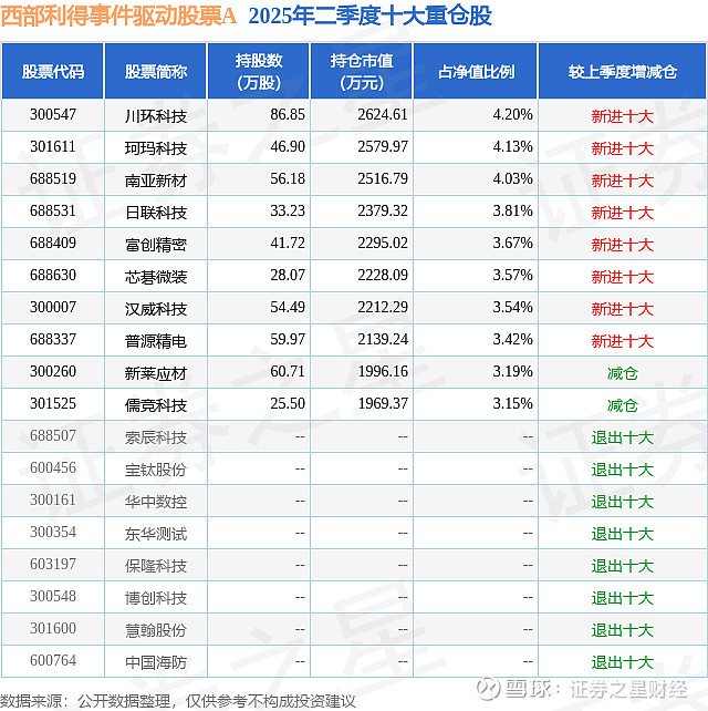 根据2025基金半年报公募基金重仓股数据,重仓该股的公募基金共5家,其中持有数量最多的公募基金为西部利得基金的西部利得事件驱动股票A。西部利得事件驱动股票A目前规模为4.75亿元,最新净值3.9447(9月30日),较上一交易日上涨0.15%,近一年上涨90.6%。该公募基金现任基金经理为张昌平。张昌平在任的基金产品包括:西部利得时代动力混合发起A,管理时间为2022年5月31日至今,期间收益率为60.47%;西部利得新富混合A,管理时间为2025年8月15日至今,期间收益率为1.95%;西部利得CES芯片指数增强A,管理时间为2025年9月6日至今,期间收益率为20.31%。