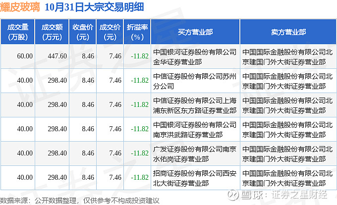 证券之星消息,10月31日耀皮玻璃发生大宗交易,交易数据如下: