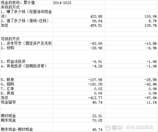 (1)钱从哪里来:经营赚的现金(以100%计算)+ 借钱(占8.7%)=108.7%;