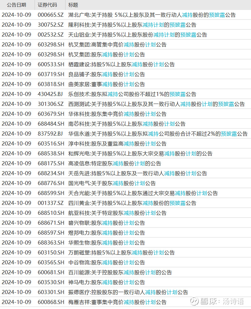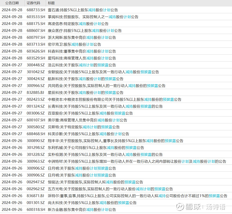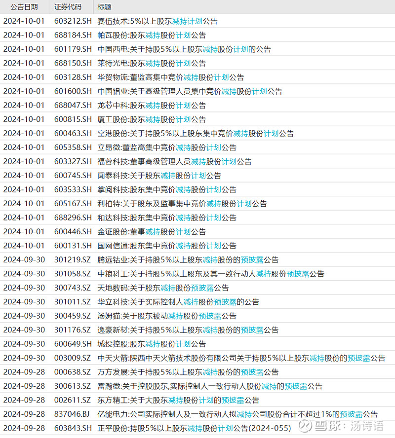 9月24日A股行情大爆发以来新发布的减持计划的公告,我粗筛了一下,有142条,可能有漏网之鱼,也可能有一个公司发了几条的,所以仅供参考。另外,这里筛选的是新发布的“减持计划”,股东也可以不减持;而那些早前就发布了减持计划、已经可以减持股票的股东近期有没有减持股票,我就没统计了。