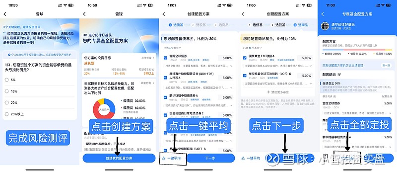 在创建配置方案页面左下方,选择【一键平均】,股债商三类资产全部选好后,就可以买入或者定投啦(点我投资三分法)