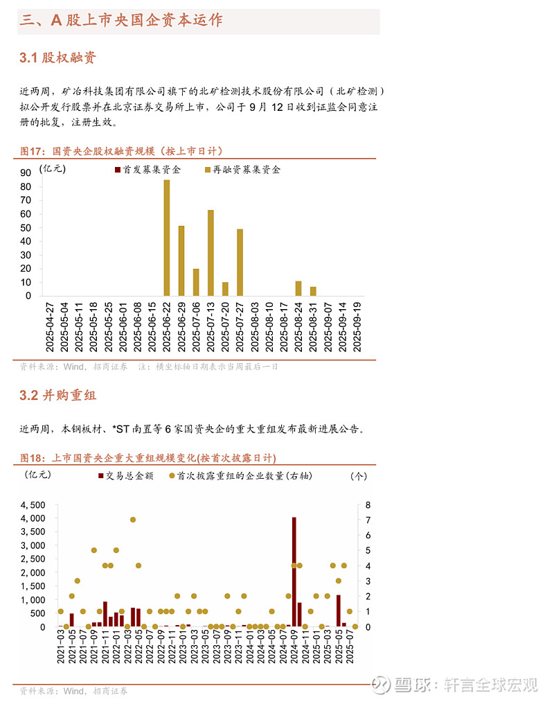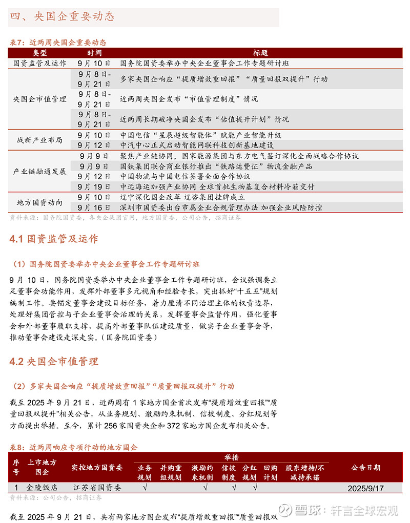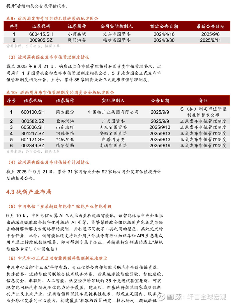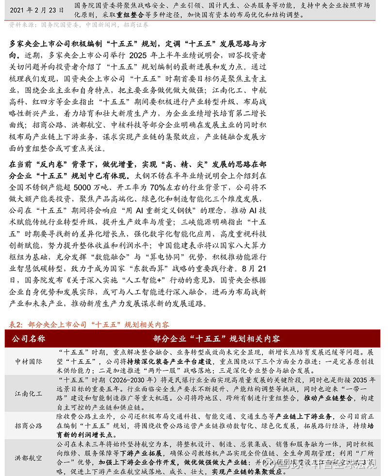 在当前“反内卷”背景下,做优增量,实现“高、精、尖”发展的思路在部分企业“十五五”规划中已有体现。太钢不锈指出将不做大额产能类投资,聚焦产品高端化、绿色化和制造智能化三个维度发展;三峡能源明确指出“十五五”时期强化数字化智能化应用,高度重视科技创新赋能,努力提升整体收益和利润水平;中国能建表示将充分发挥“数能融合”与“算电协同”优势,积极推动能源行业智慧低碳转型。8月21日,国务院发布《关于深入实施“人工智能+”行动的意见》,国资央企根据企业自身优势和发展实际,或可与人工智能进行深入融合,进而为布局战新产业和未来产业,推动新质生产力发展谋求新的发展道路。