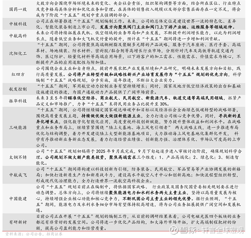 多家央企上市公司积极编制“十五五”规划,定调“十五五”发展思路与方向。近期,多家央企上市公司向投资者介绍了“十五五”规划编制的最新进展和发力点。通过梳理我们发现,国资央企上市公司“十五五”时期首要目标仍是聚焦主责主业,围绕企业主业和自身特点,把主要业务做优做大做强;江南化工、中航高科、红四方等企业指出“十五五”期间要积极进行产业转型升级、布局战略性新兴产业,着力培育和壮大新质生产力,为企业业绩增长培育第二增长曲线;招商公路、洪都航空、中核科技等部分企业明确在发展主业的同时积极布局产业链上下游业务,谋求实现产业链的集聚效应,产业链融合发展方面的重组整合或可重点关注。