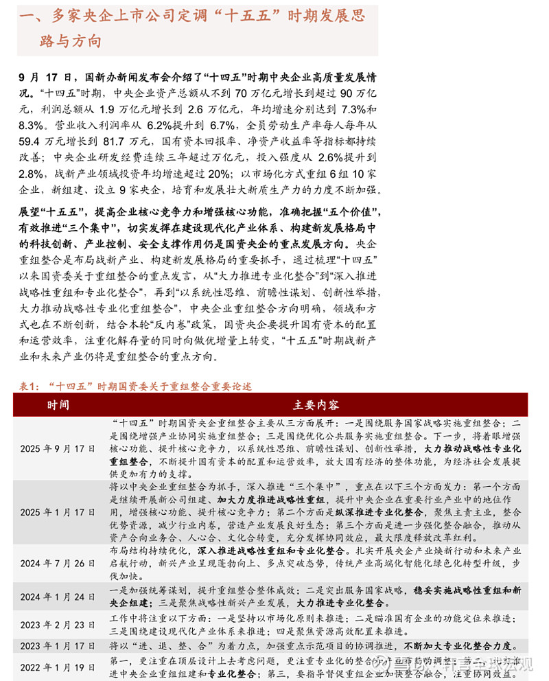 9月17日,国新办举行新闻发布会介绍“十四五”时期中央企业高质量发展情况,并指明下一步重点发展方向。近期,多家央企上市公司介绍“十五五”规划编制的最新进展和发力点。