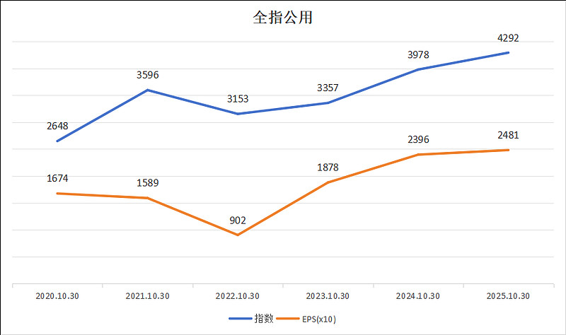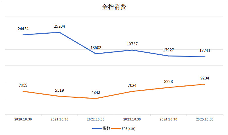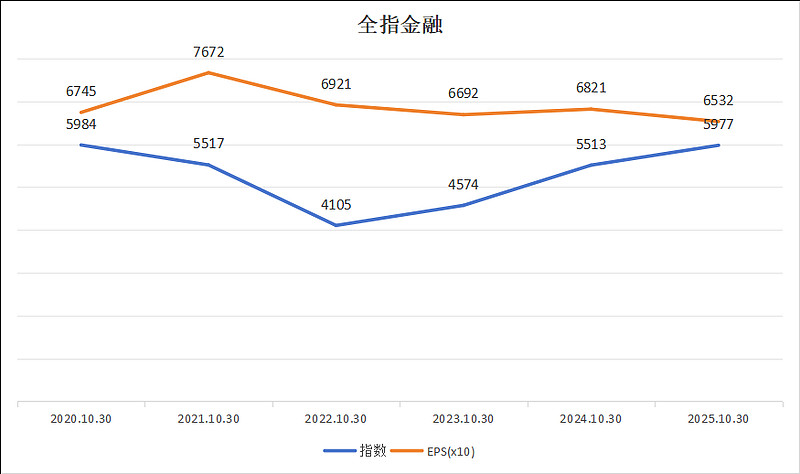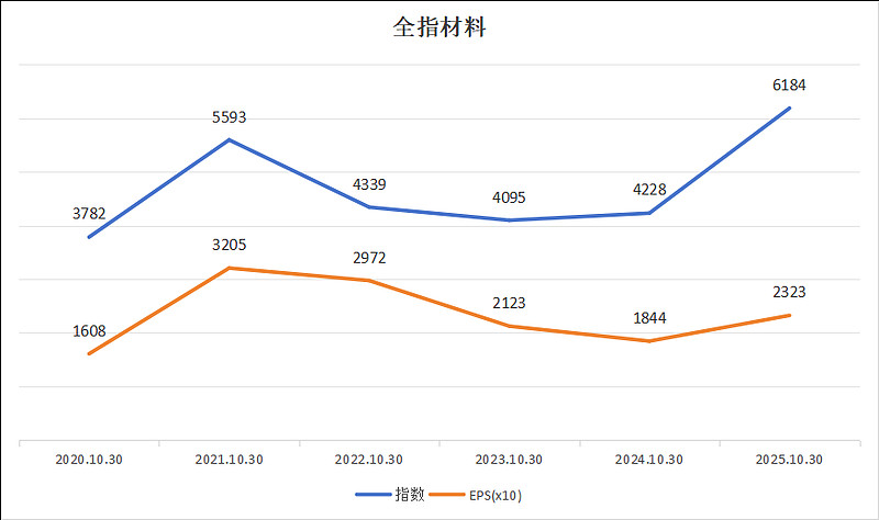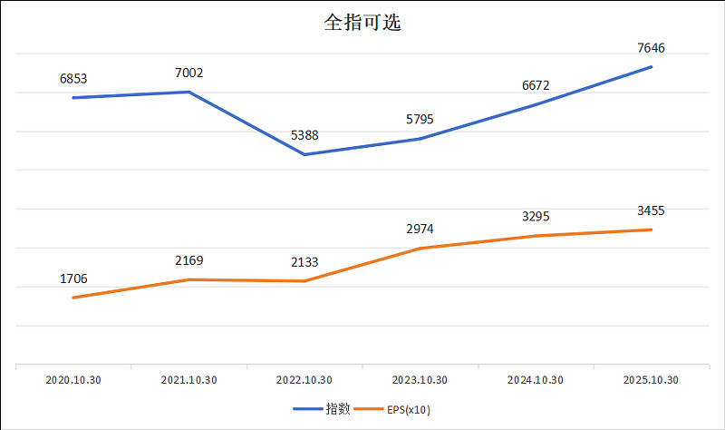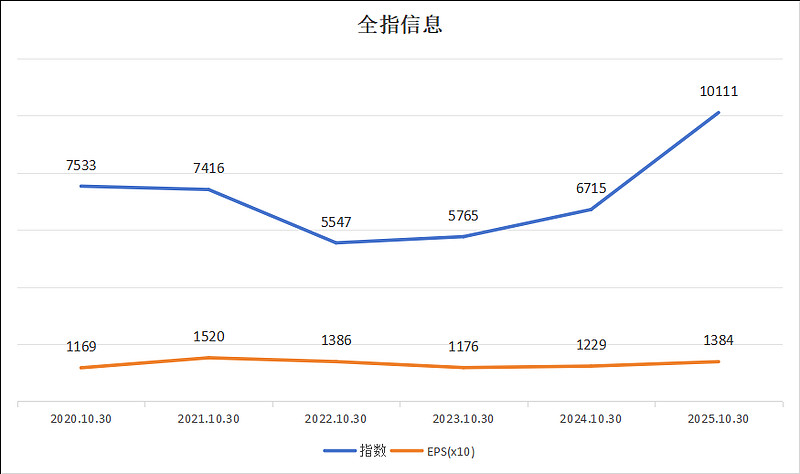 按照每年的10月30日进行统计,统计2020年10月30日到2025年10月30日,指数统统采用全收益指数。为了在同一张表中看清楚趋势,采用EPSx10。数据来自wind。