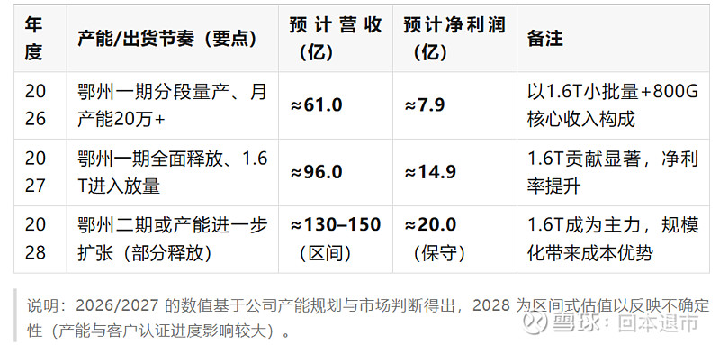 对 2026–2028 年 的业绩路径做出保守到中性假设:2026 年为产能爬坡期,2027 年进入规模化放量,2028 年成为 1.6T 市场的重要量产供应方。