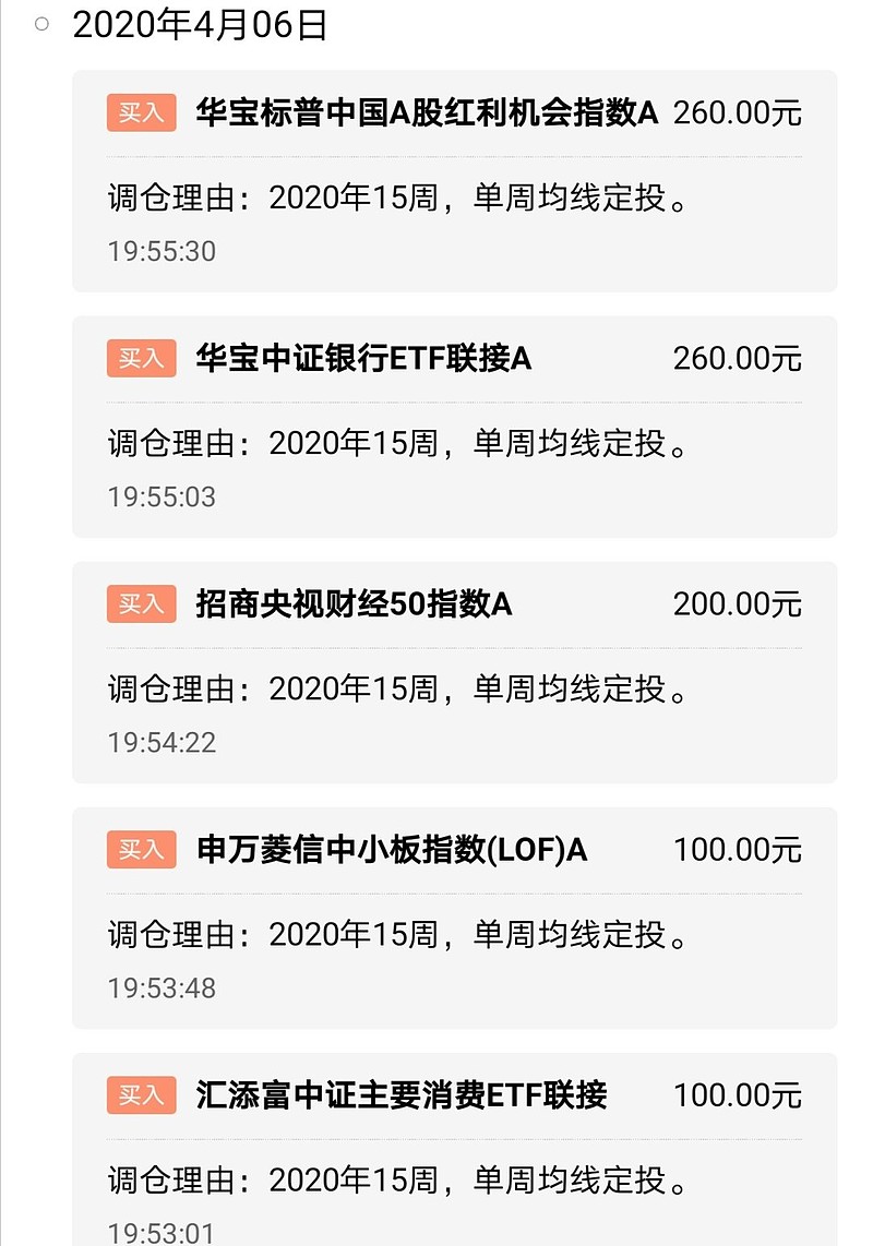 今天是2020年第15周周二,按计划执行单周均线定投,买入$华宝红利基金(F501029)$、$华宝中证银行ETF联接A(F240019)$、$招商央视50指数(F217027)$、中小板指、中证消费等5只基金,本次合计投入920元,连续两周投入超过1000元之后本周投入金额再次见到1000元以内,均线策略自动达到“低位多投、高位少投”的效果。