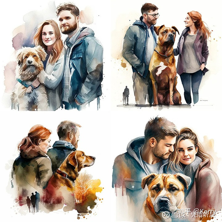4.提示词:A couple with a dog in watercolor(带着狗的夫妇俩,水粉画)