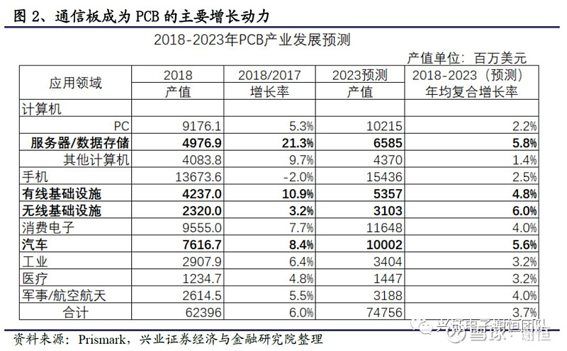根据Prismark数据,2018年全球PCB产值规模624亿美元,同比增长6%,其中服务器/数据存储、有线基础设施、无线基础设施属于通信类,合计产值规模115亿美元,同比增长13.4%,占PCB整体产值比重约为18.5%。预计到2023年通信板产值150亿美元左右,2018-2023年复合增速为5.5%,高于PCB行业整体的3.7%,比重提升至20.1%。
