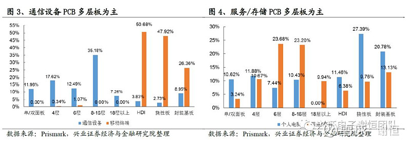 相比于大部分PCB,通信板中高速板和高频板居多。由于对容量和速度有很高的要求,在服务/存储领域,8层以上占比高达33%,通信设备领域,8层以上占比超过42%,都远高于其他细分领域。除了高速板,通信基站设备,以天线板和功放板为例,需要处理射频信号,大量使用高频板。