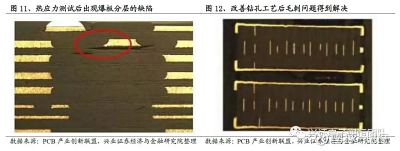采用高TG、高速、高频、厚铜类特殊板材,增加了钻孔粗糙度、钻孔毛刺和去钻污的难度。层数多,累计总铜厚和板厚,钻孔易断刀;密集BGA多,窄孔壁间距导致CAF失效问题;因板厚容易导致斜钻问题。