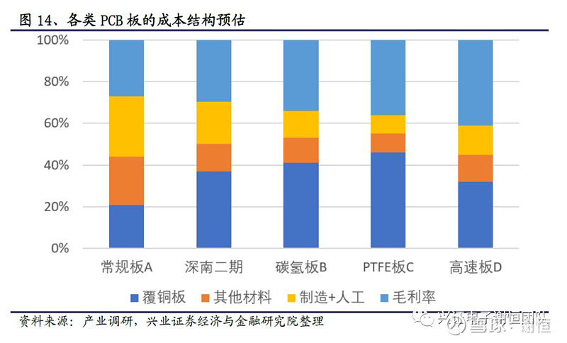 因此,相对于普通的PCB,高频板和高速多层板都有较高的技术壁垒,除了高精密的设备外,大批量生产需要长时间Know-How的积累,也具有更大的盈利空间。而高频板和高速多层板两者之间,高频板的主要难点在于高频板材,高速多层板的主要难点在于制造工艺。根据产业调研,常规PCB的覆铜板占销售比重的20%左右,使用PTFE的高频板板材占销售比重的40%以上,高速多层板板材占销售比重30%左右,在相同开工率和良率情况下,高速多层板的加工附加值更高,利润空间也更大,部分高速板毛利率可以高达40%以上。