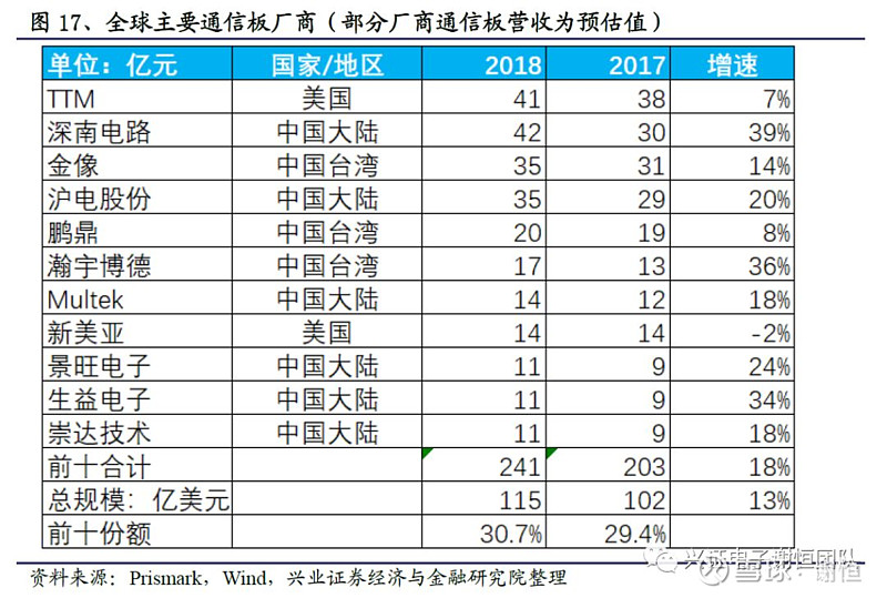 根据我们整理,全球前十大通信板厂商2018年通信板营收241亿元,同比增长18%,高于行业13%的增速,合计份额30.7%,同比提升1.3个百分点。