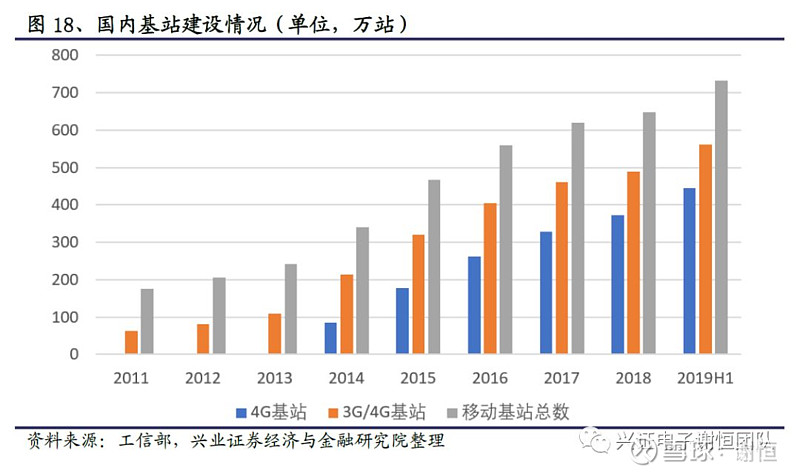 通信基站建设是通信板的主要拉动力量之一,根据工信部数据,国内2014年开始大规模建设4G基站,2014-2016年为4G基站建设高峰期,2017、2018年建设量快速下滑,今年因为移动网络扩容升级,6月底4G基站数目达到445万个,比2018年末大幅增长。5G基站上半年开始建设,今年国内预估建设量15万站左右。