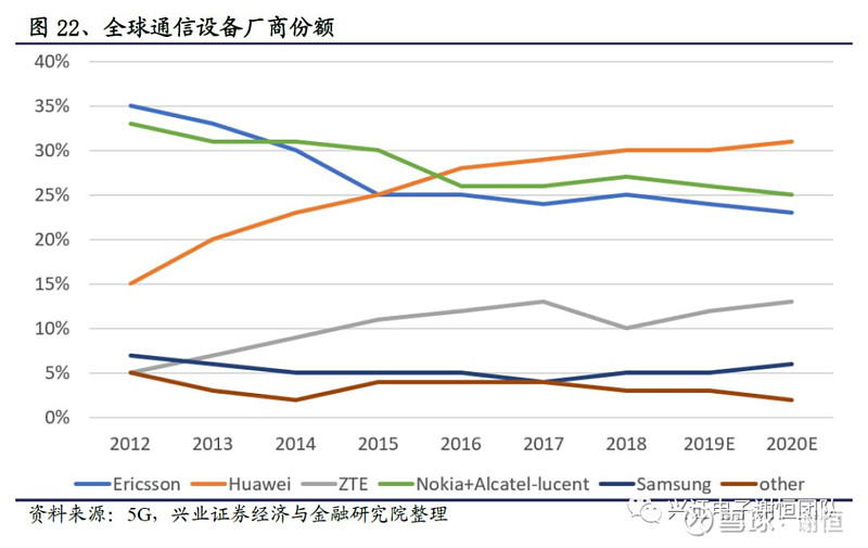 我们认为,最核心的在于格局的变化。首先是下游客户通信设备厂商在全球的市占率,2014年,国产设备厂商华为+中兴市占率30%左右,2017年提升至40%以上,相应地,爱立信和诺基亚(2016年收购阿尔卡特朗讯)的市占率则持续下滑。
