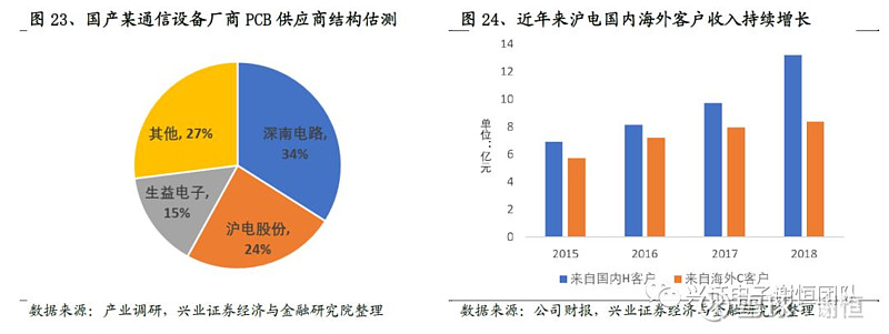 其次是国内通信板龙头公司在客户的份额持续提升。以深南电路为例,2018年来自国内两大通信设备厂商收入合计24亿元,2015-2018三年复合增速35%,沪电股份2018年来自国内某大型通信设备厂商收入13.2亿元,2015-2018三年复合增速24%。