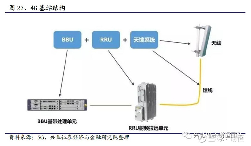 一个基站,通常包括BBU(主要负责信号调制)、RRU(主要负责射频处理),馈线(连接RRU和天线),天线(主要负责线缆上导行波和空气中空间波之间的转换)。