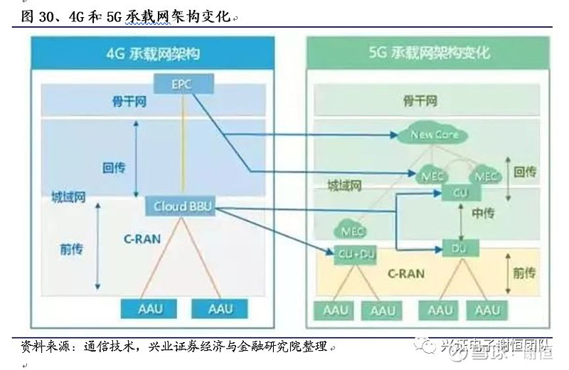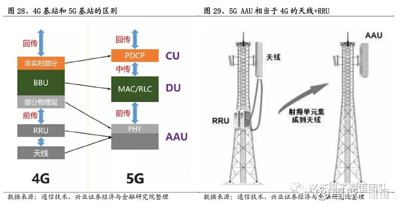 在5G网络中,接入网被重构为以下3个功能实体:CU(Centralized Unit,集中单元)、DU(Distribute Unit,分布单元)和AAU(Active Antenna Unit,有源天线单元)。将原BBU的非实时部分将分割出来,重新定义为CU,负责处理非实时协议和服务,BBU的剩余功能重新定义为DU,负责处理物理层协议和实时服务,BBU的部分物理层处理功能与原RRU及无源天线合并为AAU。