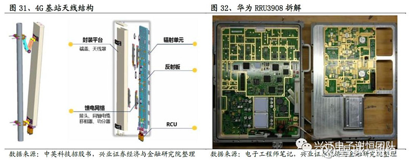 4G天线系统主要包含馈电网络、辐射单元、发射板、RCU和封装平台五个部分,一副天线的馈电网络板和辐射单元(即阵子)使用的PCB面积大约0.2平米,一般是双面板,单价在2000元/平米左右。