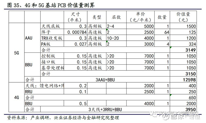 根据我们测算5G基站一副AAU价值量在3000元以上,一个BBU价值量3000元以上,单站3副AAU、一个BBU合计价值量1.26万元,4G基站单站价值量4000元左右,5G基站PCB价值量超过4G的3倍。
