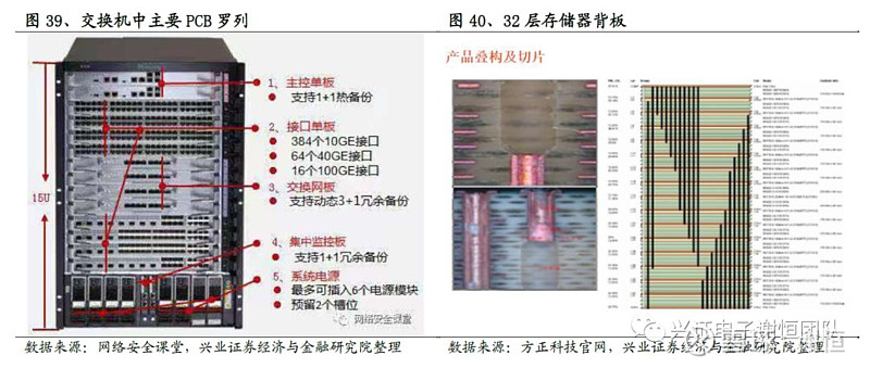 交换机一般也包括背板、主控单板、接口单板和交换网板等。服务器、交换机、存储器使用的PCB特点主要体现在高层数、高纵横比、高密度及高传输速率,即高速多层板。