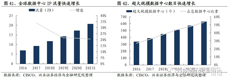 我们已经进入了一个数据爆炸的时代,云计算的需求越来越大,根据Cisco数据,2021年全球数据中心IP流量将达到20.6ZB,2016年-2021年复合增速达到25%。相应的,超大规模数据中心(Synergy定义为:拥有几十万台,甚至是数百万台服务器的数据中心)数目将迎来快速增长,根据Cisco数据,2017年全球超大规模数据中心数目达到386个,占比32%,2021年将达到628个,占比53%。