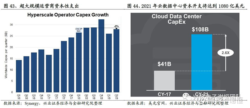 从全球主要云计算、云服务公司的资本开支中也可以得到验证,根据Synergy Research数据,2018年超大规模运营商的资本性支出接近1200亿美元,同比增长43%。今年Q1、Q2资本支出短期有所回落,我们认为云计算、存储需求的增长是不可逆的,美光也指出,2021年全球云数据中心资本开支将达到1080亿美元,超出2017年2.6倍。