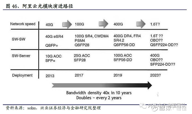 除了设备出货量增长之外,对传输速率的要求也越来越高,每两年网络设备的带宽密度翻倍,高速交换机、高速光模块占比持续提升。