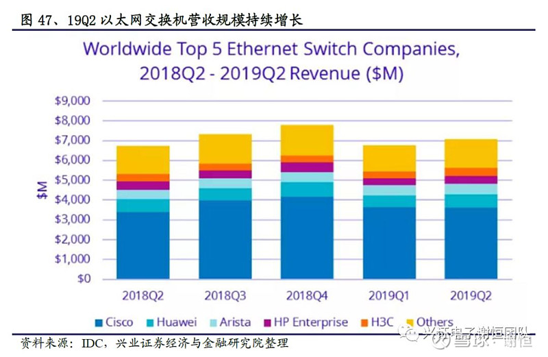 虽然今年Q1、Q2数据中心资本开支微幅下滑,但是以太网交换机的营收规模缺持续增长,今年Q1、Q2营收分别达到68、70.7亿美元,同比增速分别为7.8%、4.8%,主要得益于向100G高速交换机的切换,19Q2全球100G交换机销售额同比增长42.9%达到12.8亿美元,市占率从去年同期的13.2%提升至18.1%。