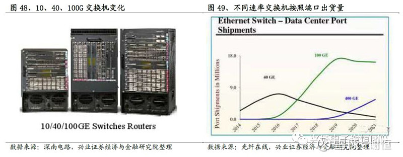 18年年底,全球最大的交换机厂商思科推出了400G交换机,我们预计明年400G交换机有望迎来放量,从10G到40G,再到100G、400G,端口速率的快速提升,带动PCB板的价值量大幅增加:1)40G、100G一般使用松下M4、M6高速板材,400G需要使用松下M7等级;2)400G使用的PCB层数要更高,根据产业调研,400G交换机PCB在36层及以上,100G的不超过30层。同时,制造壁垒也会提升,一般网络设备中高速交换机的PCB难度要高于服务器。