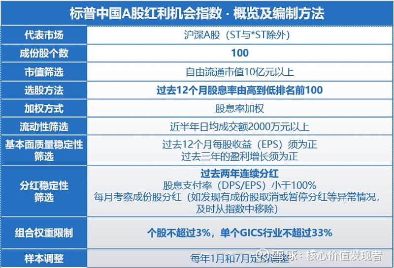 就组合的定期调整安排,标普中国A股红利机会指数在采用过去一年分红金额计算股息率的同时,每年在1月和7月对指数进行两次定期调整,这就可以有效把握红利周期的动态调整机会,也便于投资人采取长期持有的操作策略,避免“短线博弈”之坑。