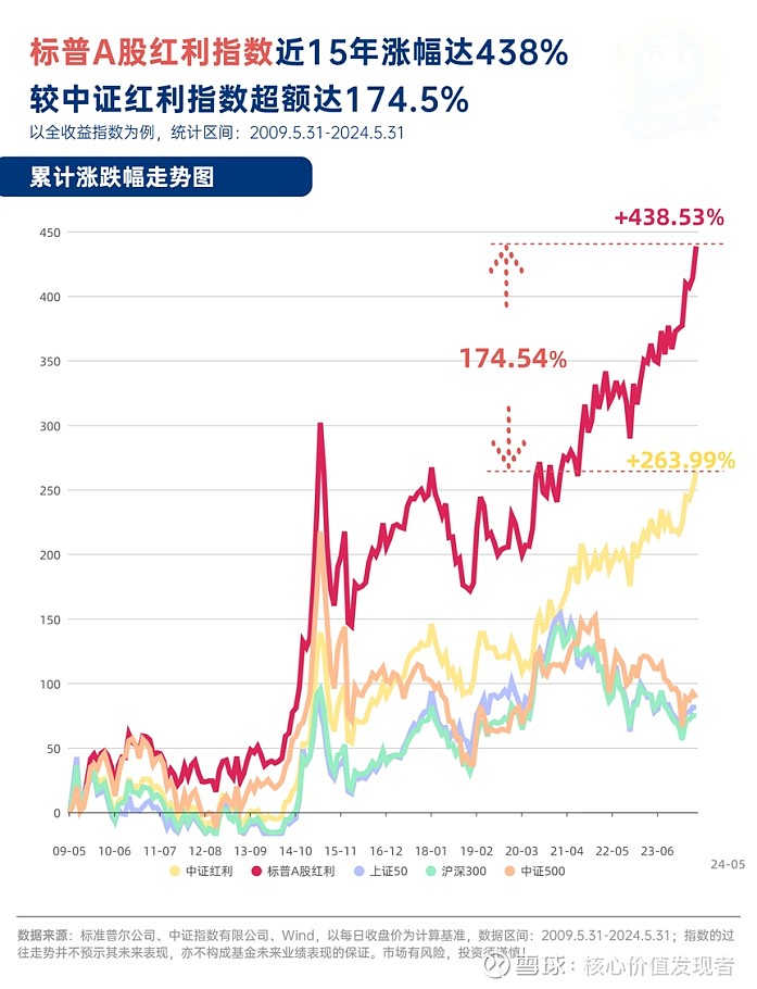 在全收益口径下,标普中国A股红利机会指数自2009.5.31以来截至2024.5.31的15年间,其累计涨幅达438.53%,大幅超越上证50、沪深300、中证500等“老牌”宽基指数同期表现。红利策略穿越A股牛熊考验,更彰显了长期投资价值。