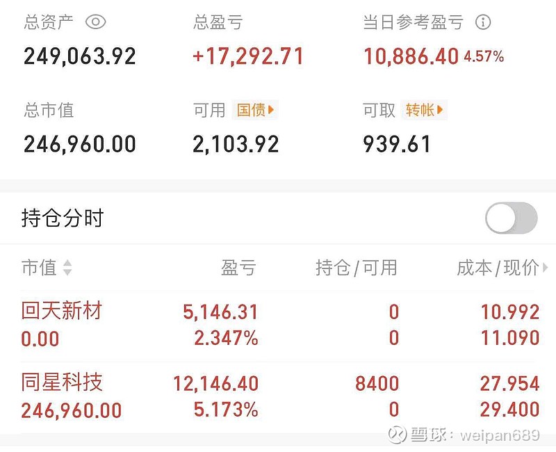 20万实盘操作记录第85天,账户249063。卖出回天新材,买入同星科技。回天新材低开,一直弱势横盘,早上出来了,下午买入同星科技,还不错,刚买入很快拉升,这几天跟进的超跌股都还不错,盘面转强再做强势股吧#股票# #财经# #实盘记录#